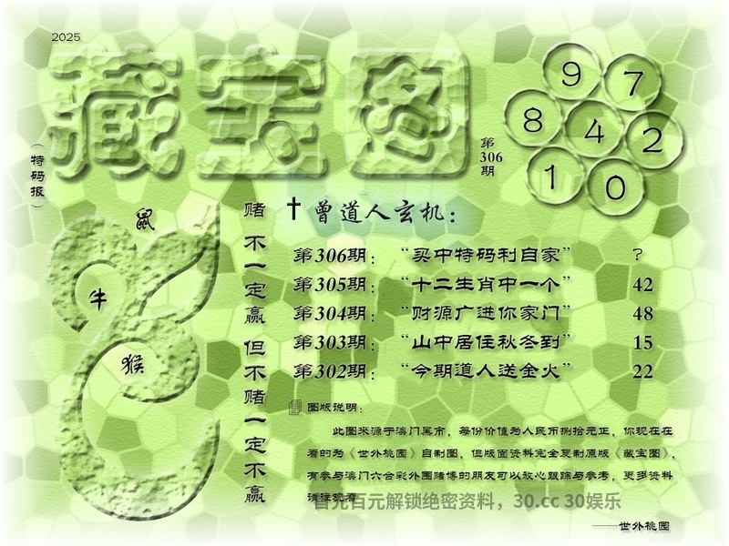 | 303期⑨肖 | 马兔猴羊狗蛇龙猪鼠 | 开兔15 |