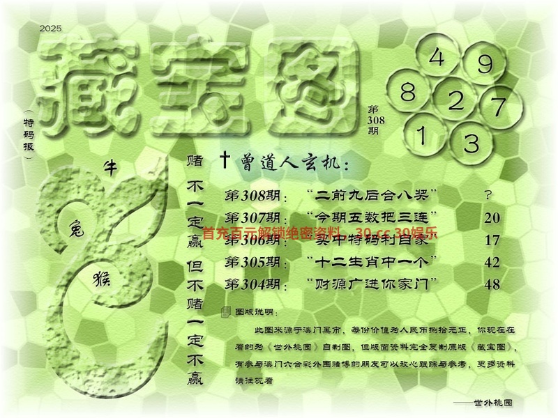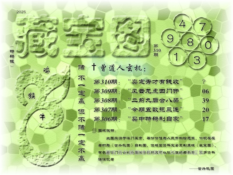 | 310期:澳门正版藏宝 【卖定秀才有钱收】 解:卖定秀才有钱收,有钱收,接解肖蛇鸡龙马羊兔。 综肖:蛇鸡龙马羊兔虎 |